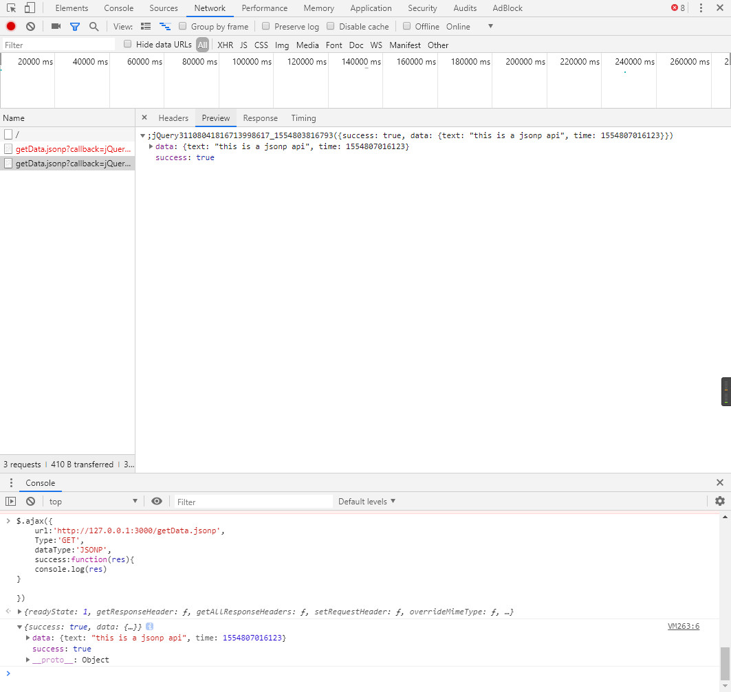 app.use(async ctx=>{ if(ctx.method === 'GET' && ctx.url.split('?')[0] === '/getData.jsonp'){ let callbackName = ctx.query.callback || 'callback' let returnData = { success:true, data:{ text:'this is a jsonp api', time: new Date().getTime() } }