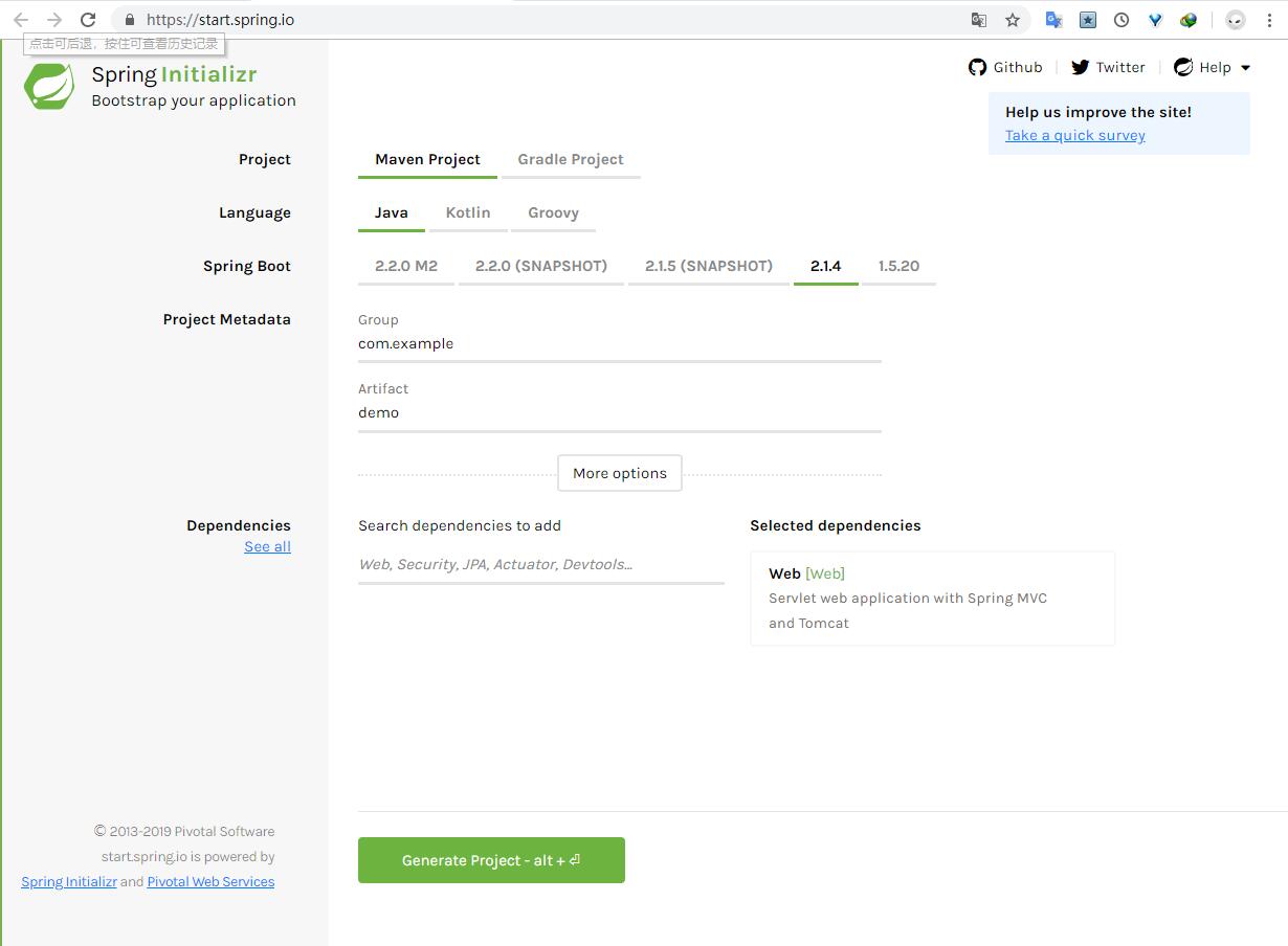 通过使用Spring Initializer来引导出初始化一个SpringBoot应用,首先,你需要访问Spring Initializer 网页https://start.spring.io/并且选择适合的Build,Spring Boot Version和Platform,然后你需要提供Group,Aritfact和运行用所需要的依赖。点击Generate Project按钮,就会下载初始化项目压缩包。